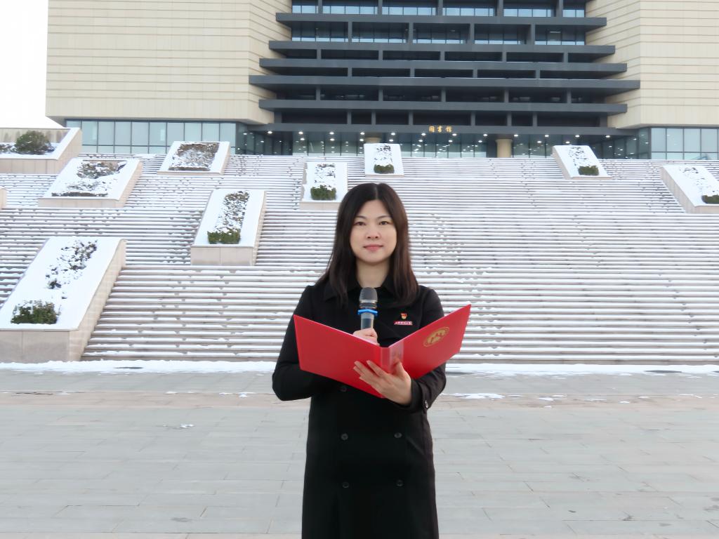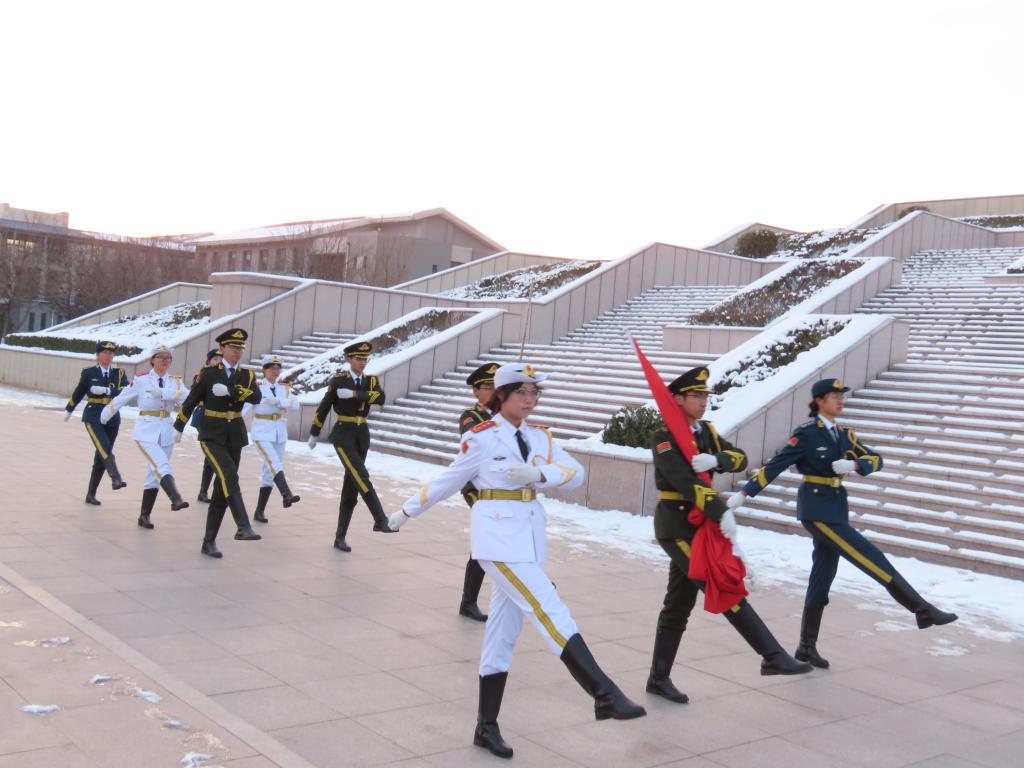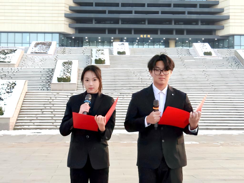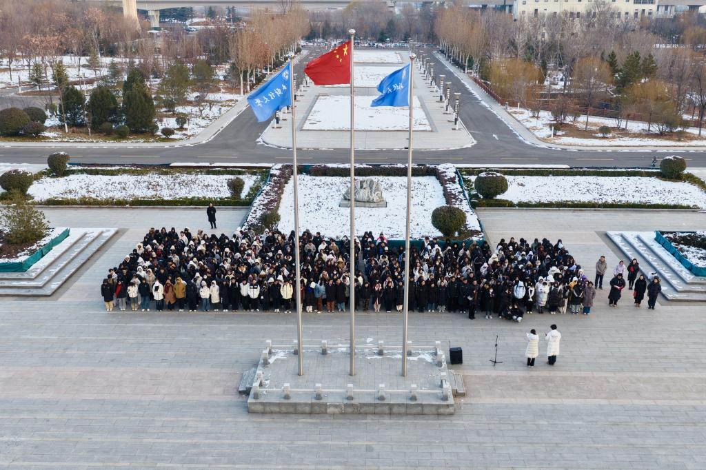 在章丘校区图书馆广场联合举行升旗仪式。辅导员陈盈君、任康、尤泽民、范雅欣及500余名学生代表共同参加。